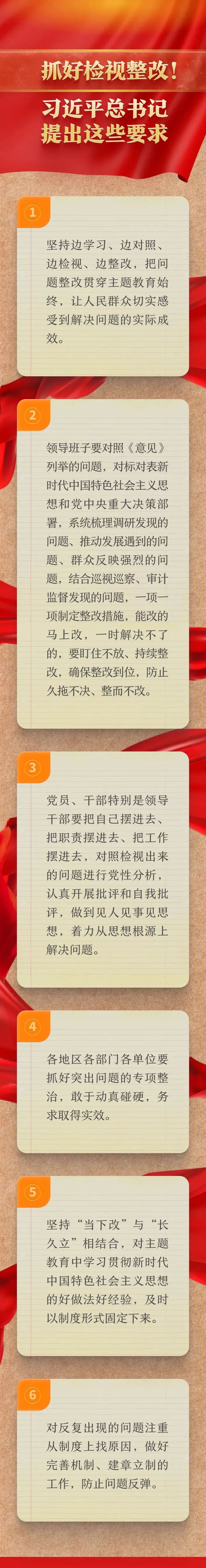 《求是》雜志近期刊發(fā)的習(xí)近平總書記重要文章《在學(xué)習(xí)貫徹習(xí)近平新時代中國特色社會主義思想主題教育工作會議上的講話》中,總書記對抓好檢視整改提出明確要求。